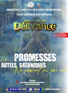 Le Ministère Chrétien des Vrais Adorateurs (MICVA) organise la cinquième édition du séminaire de délivrance. Prévu pour durer quatre jours, ledit séminaire se tient du lundi 08 au jeudi 11 Décembre 2025 et portera sur le thème: »Les promesses des autels sataniques ne passeront pas par moi ». Plusieurs orateurs puissamment oints vont intervenir dans le cadre de ce programme, il s’agit du Pasteur Ulrich Nicoue, Apotre Lionel Yaovi, Dr Gontrand Koukoui et du Prophète Constant Hounsa. Ce séminaire de délivrance qui se tient en cette fin d’année est le moment idéal pour la restauration et le salut des âmes. C’est pourquoi le Prophète Constant Hounsa, premier responsable de l’église, invitera les fidèles et toute la communauté chrétienne de Cotonou et de ses environs à se joindre à ce programme tous les soirs à partir de 18h30. C’est à Cotonou sur le site de Missèbo, vons après la pharmacie Attinkanmey, 8è maison à droite.